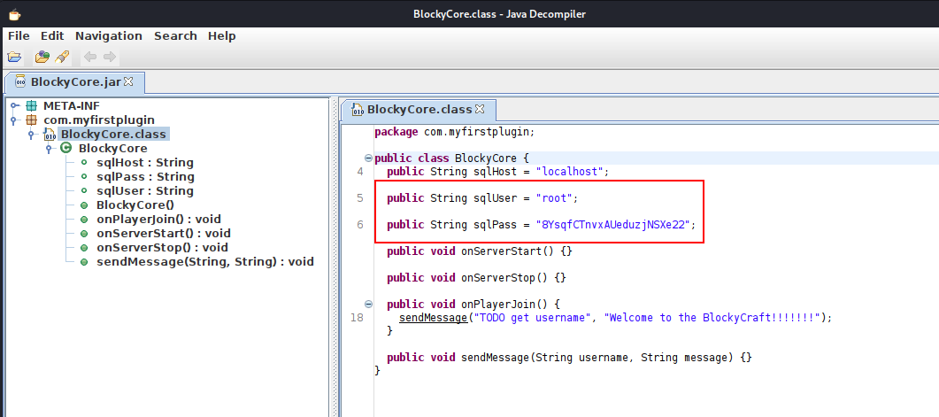 We used jd-gui to analyze the BlockyCore.jar file. The archive was simple and contained only a single class: BlockyCore.class.