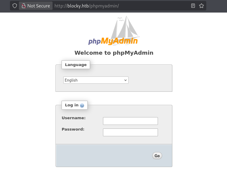 /phpmyadmin page displayed a standard login panel. We attempted several credentials but were unsuccessful.
