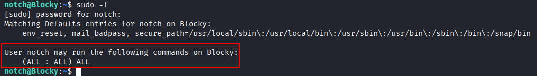 After gaining initial access as notch, the first step was to check which commands the user is allowed to run with sudo privileges: