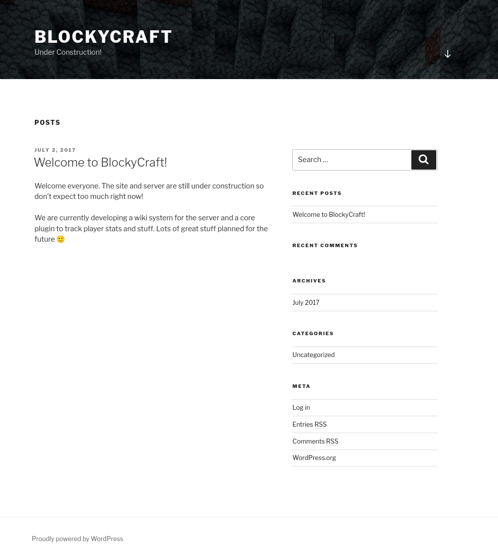 After updating the hosts file, the site loads successfully and returns the BlockyCraft blog page, which appears to be under construction.