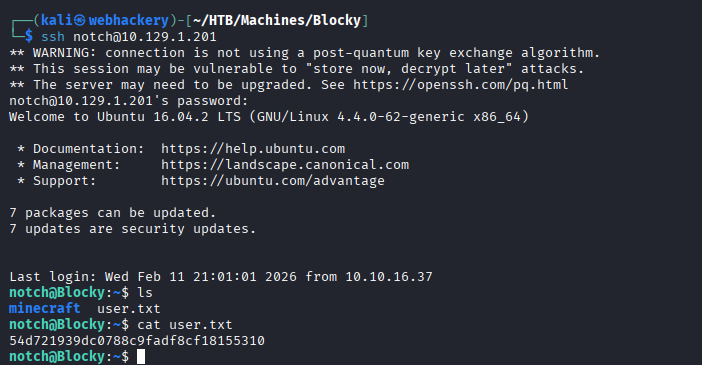 From earlier enumeration, we identified the user Notch. We attempted to reuse the discovered password for the notch user via SSH and successfully obtained initial access.